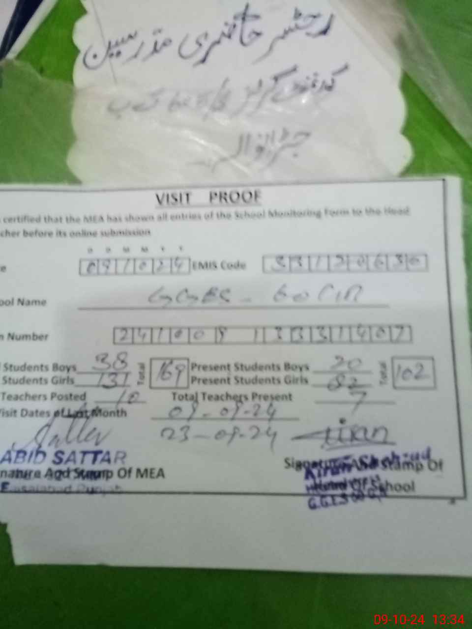 | Certified that this School was Inspected by the Undersigned MEA/DMO Today and the Information Stated Above is as Per Record. | |||||