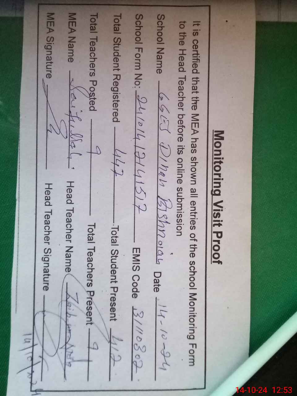| Certified that this School was Inspected by the Undersigned MEA/DMO Today and the Information Stated Above is as Per Record. | |||||