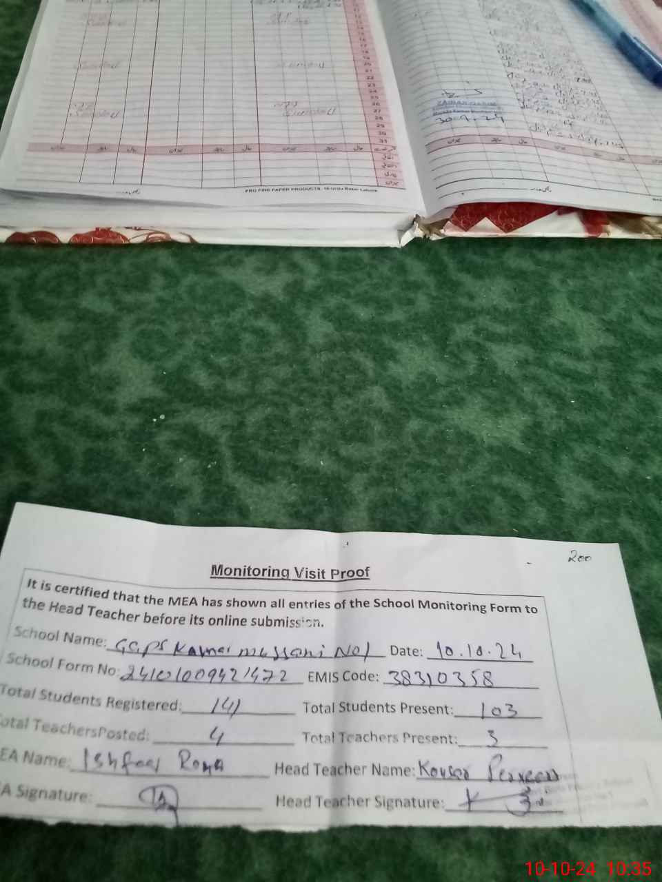 | Total no. of Classrooms: 4 No. of Classrooms Used for Teaching: 4 No. of Classrooms Storing Old Furniture, FTBs, etc: 0Comments if Any: pst kalsoom Aziz on casual leave but his online leave was approved in my presence SG saleem iqbal was physical absent but marked present on register drinking water in cooler was contaminated with sand inside hand wash of water tap having slippery floor |