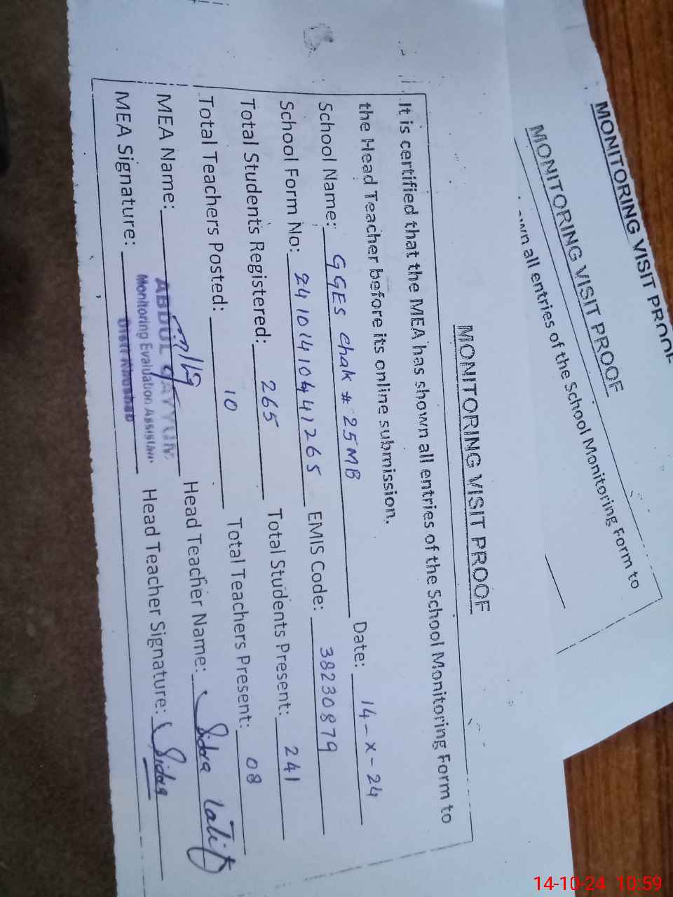 | Certified that this School was Inspected by the Undersigned MEA/DMO Today and the Information Stated Above is as Per Record. | |||||