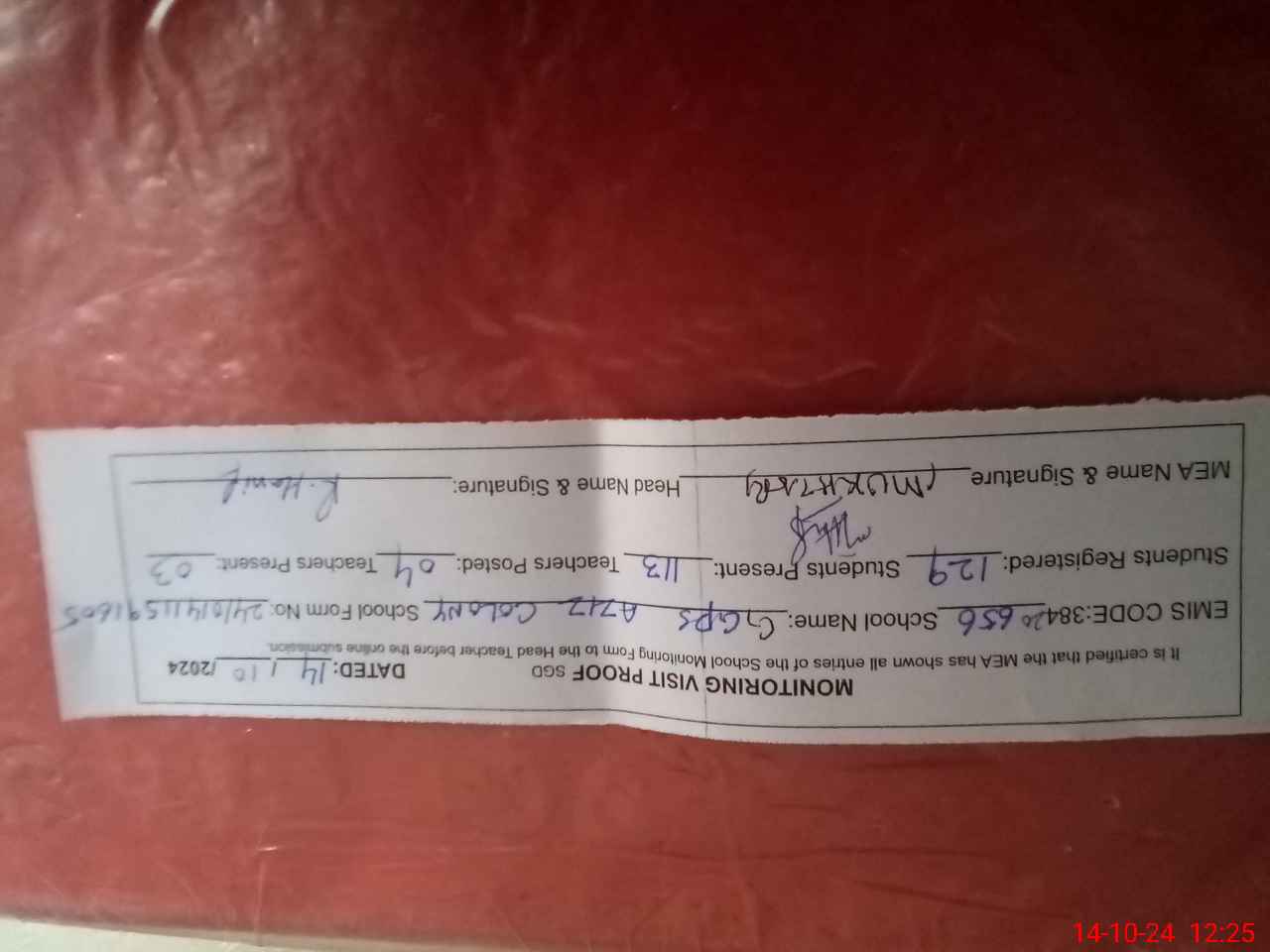 | Attendance Register | Head Teacher | MEA with School | Visit Proof |