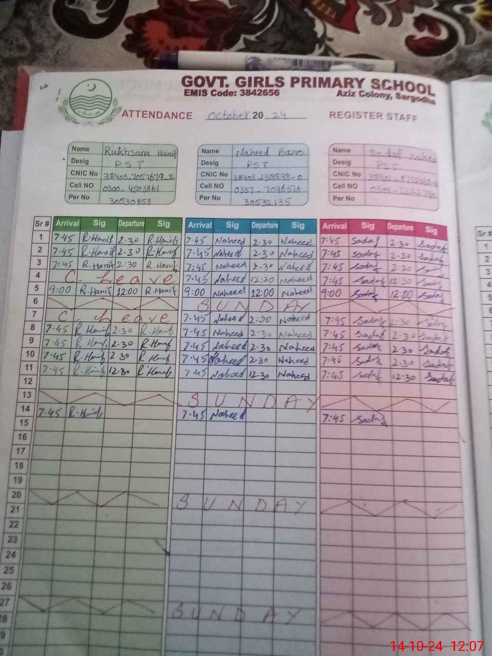 | CNIC | Full Name | Designation | R/C | Absence During Last Calender Month |
