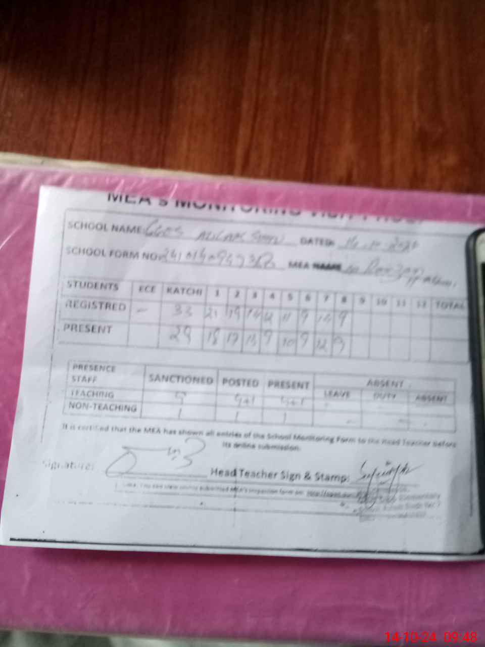 | Attendance Register | Head Teacher | MEA with School | Visit Proof |
