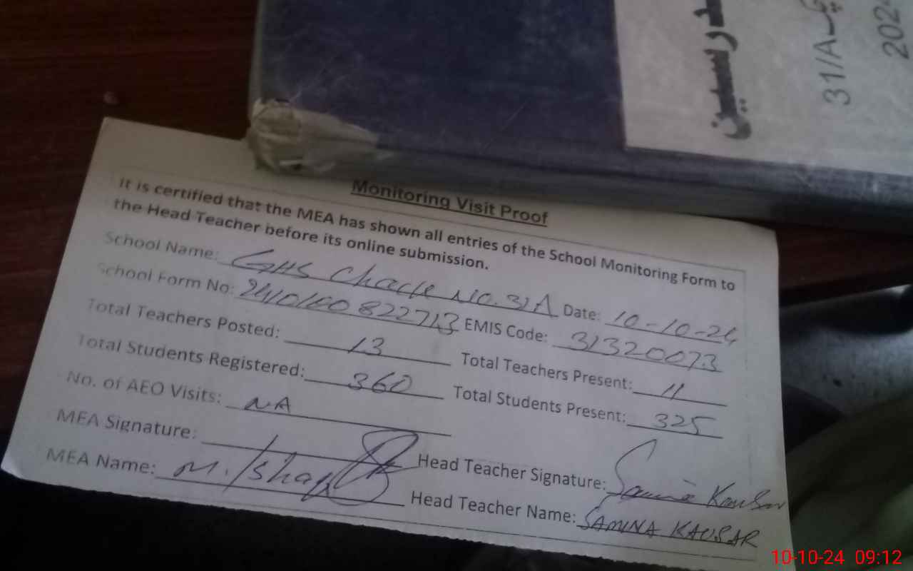 | Attendance Register | Head Teacher | MEA with School | Visit Proof |