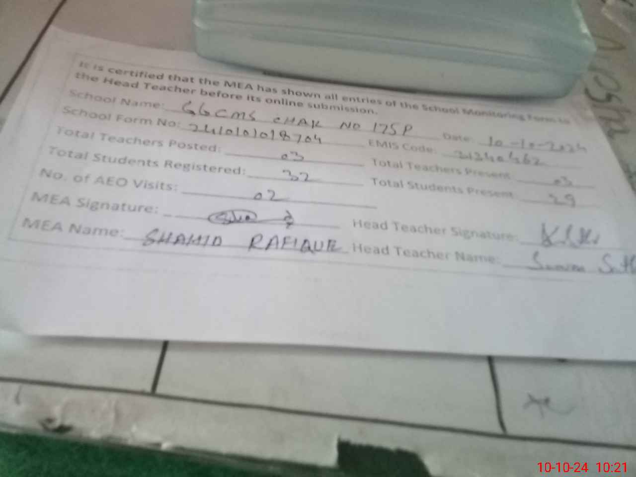 | Attendance Register | Head Teacher | MEA with School | Visit Proof |