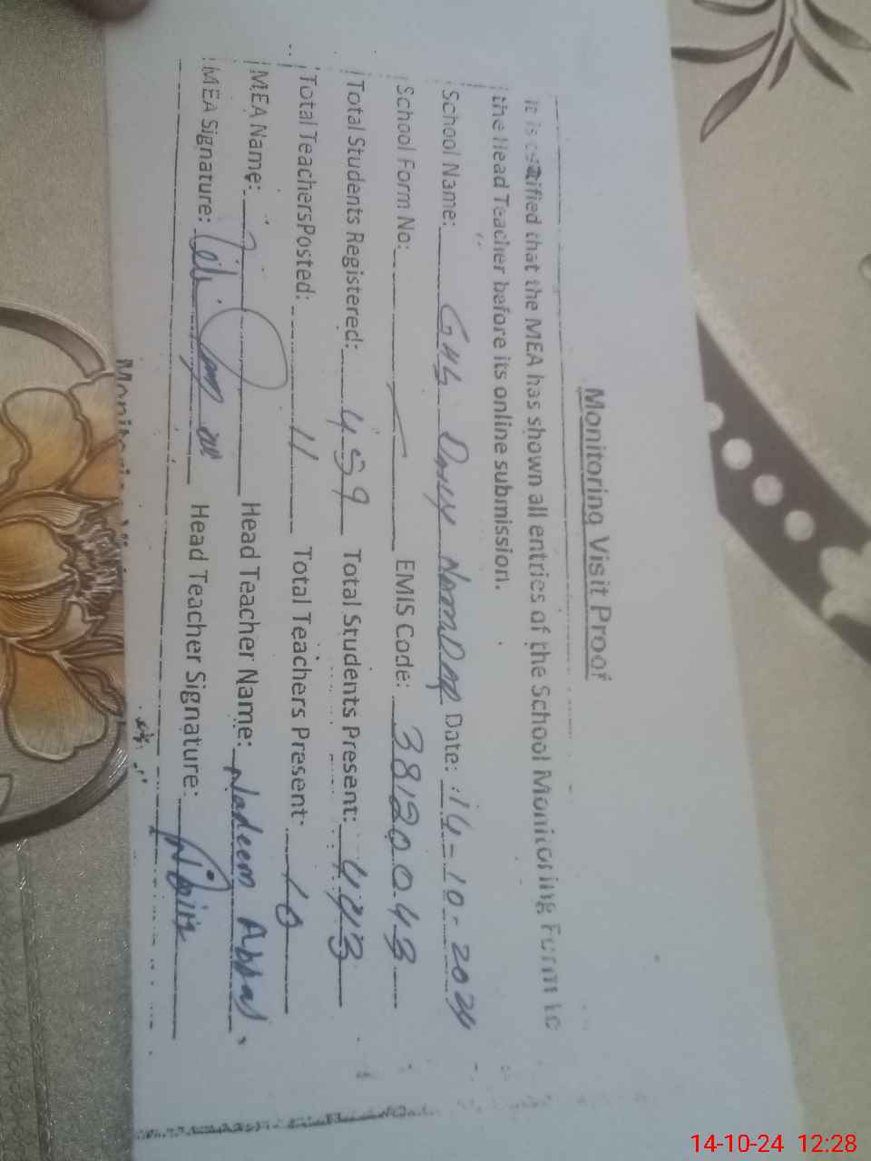 | EMIS Code: 38120043 | Name of School: GHS DAILY NAMDAR | |||