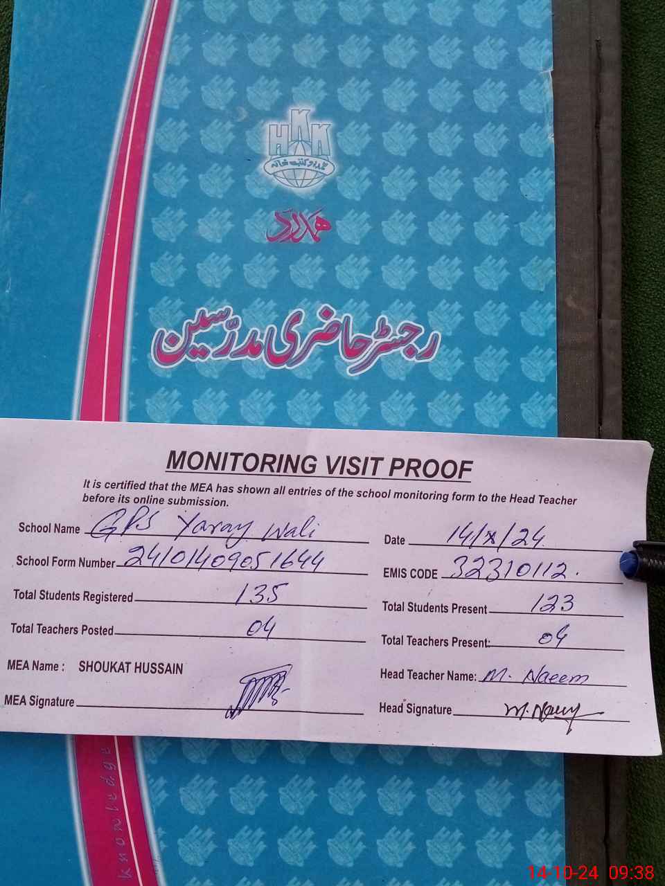 | Attendance Register | Head Teacher | MEA with School | Visit Proof |