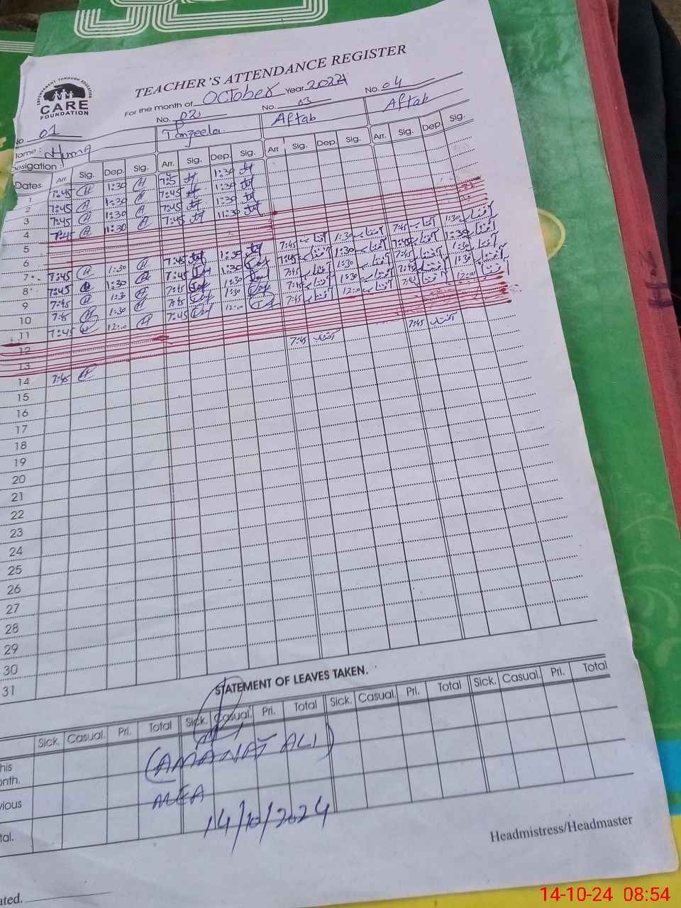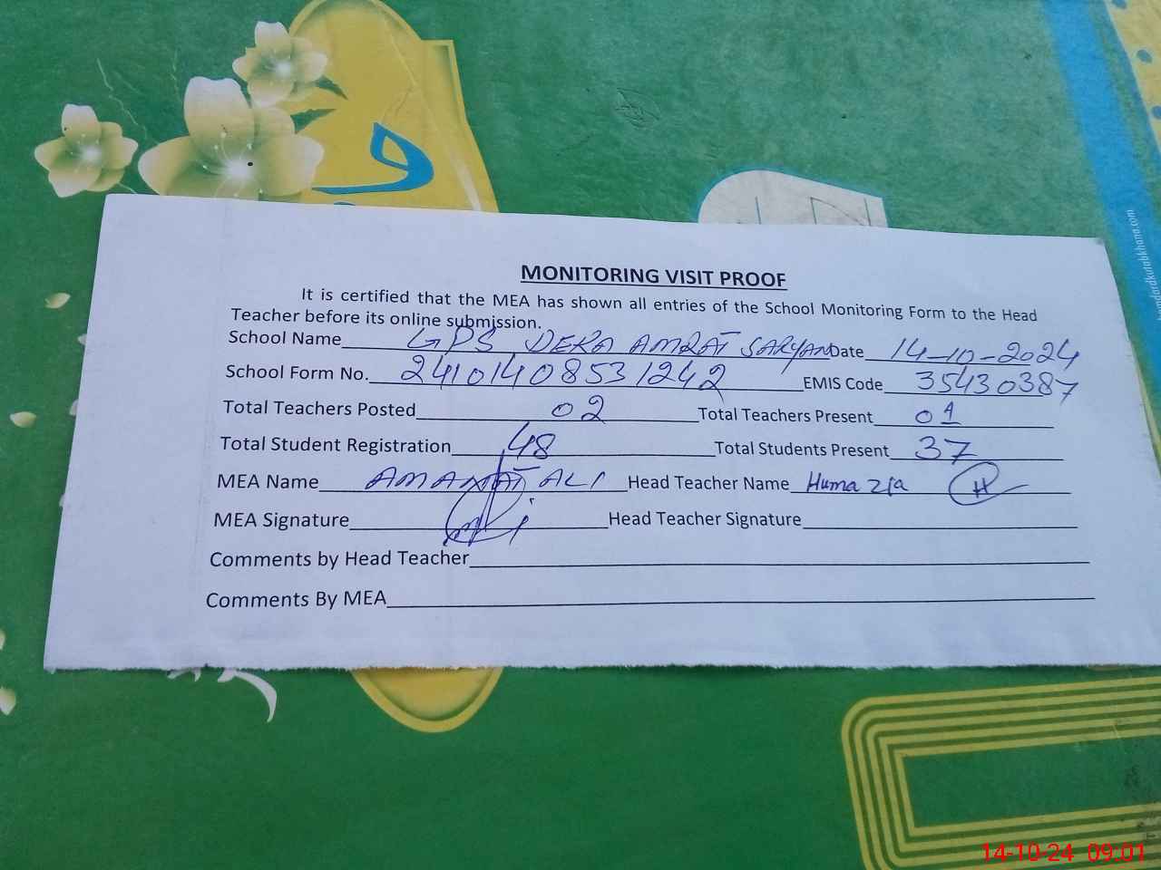 | Attendance Register | Head Teacher | MEA with School | Visit Proof |
