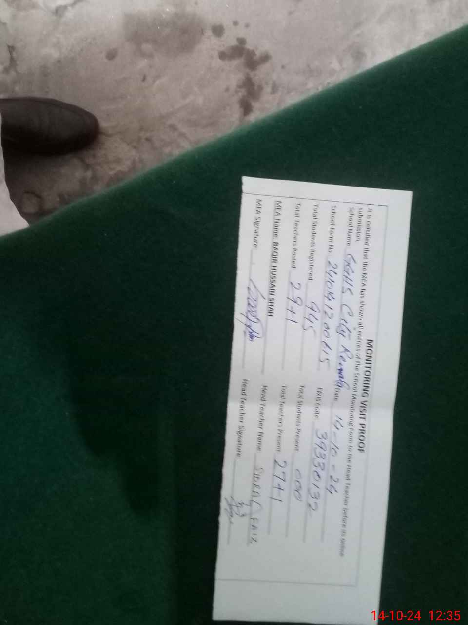 | Certified that this School was Inspected by the Undersigned MEA/DMO Today and the Information Stated Above is as Per Record. | |||||