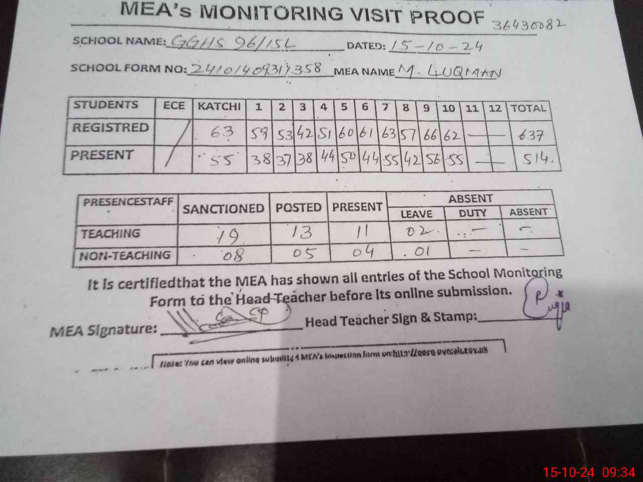 | EMIS Code: 36430082 | Name of School: GGHS 96/15-L, MIAN CHANNU | |||