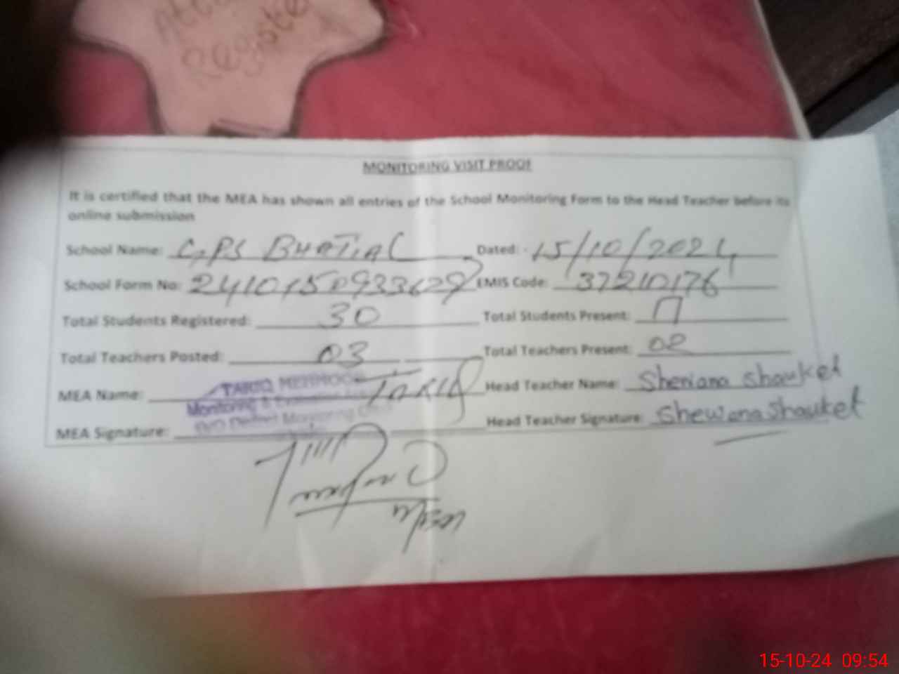 | Attendance Register | Head Teacher | MEA with School | Visit Proof |