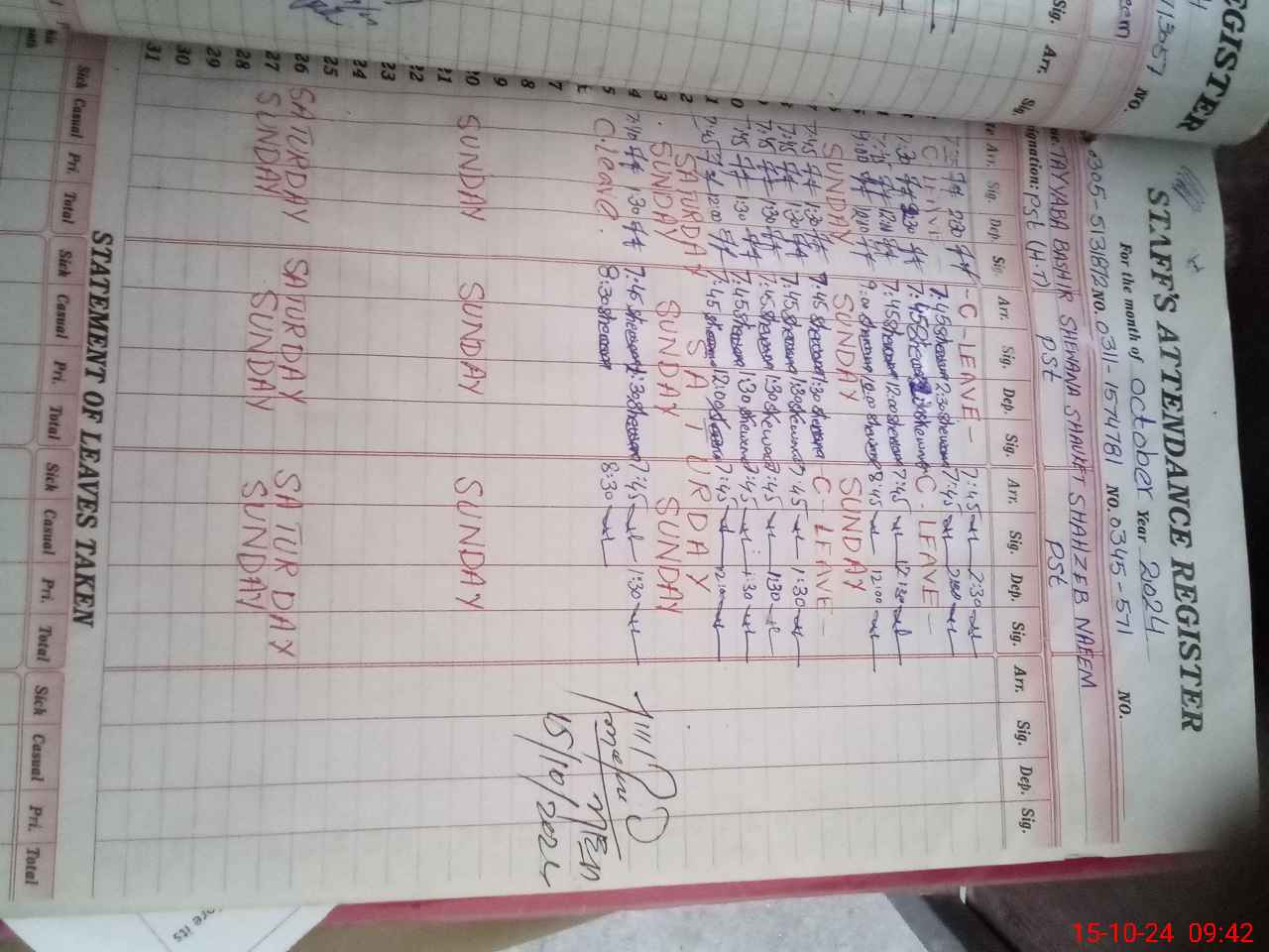 | Remarks (Use Separate Page if Required): Head Teacher C Leave is not approved online by AEO Therefore marked absent | |||||