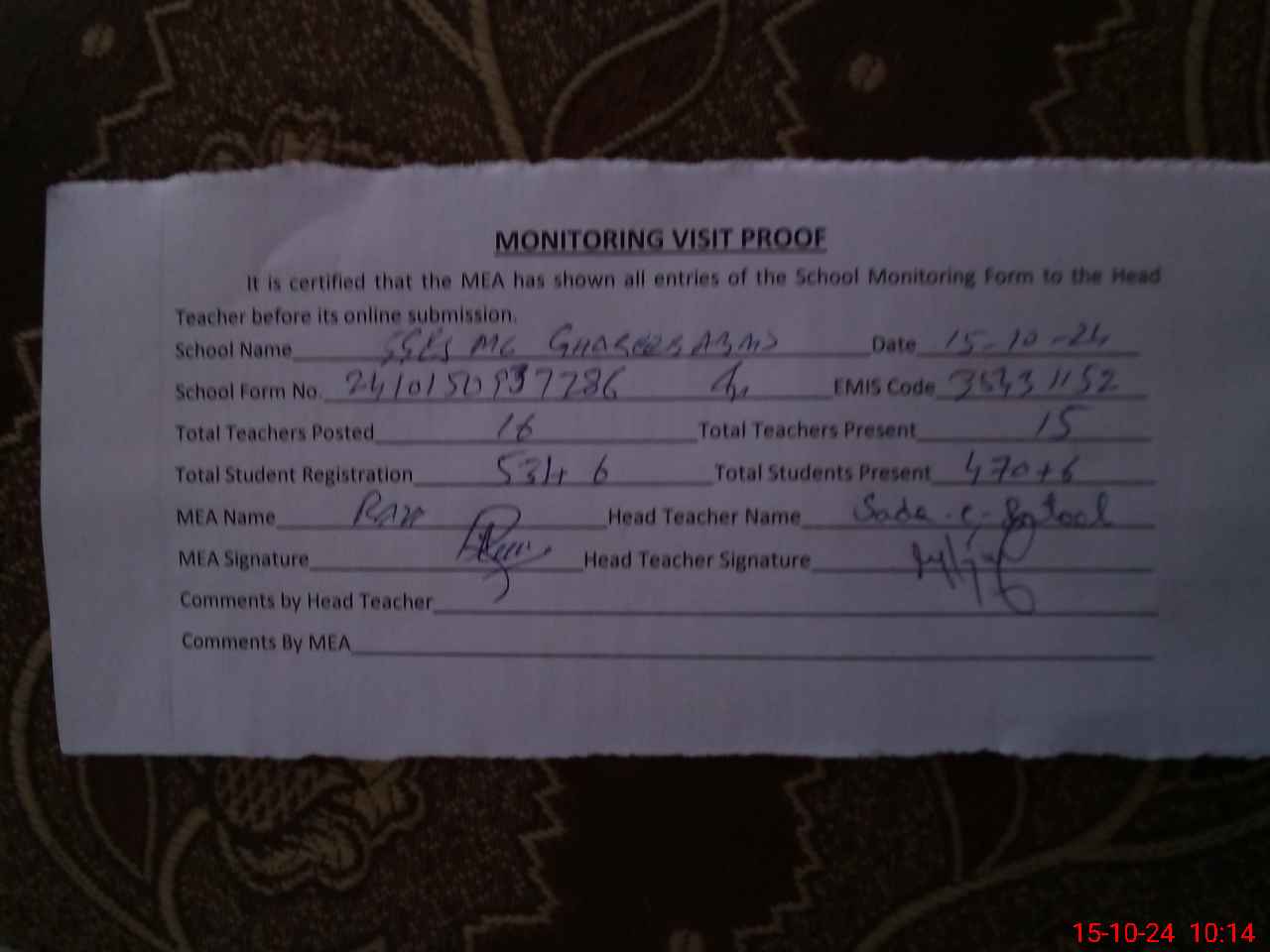 | Attendance Register | Head Teacher | MEA with School | Visit Proof |