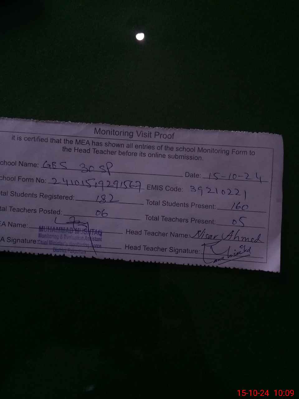 | Attendance Register | Head Teacher | MEA with School | Visit Proof |