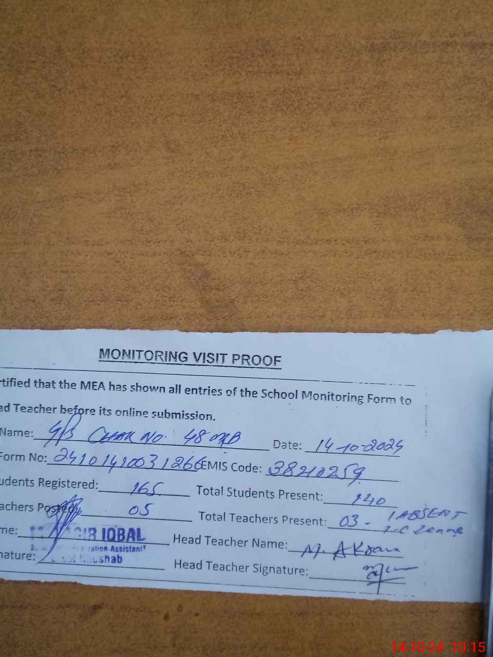| Attendance Register | Head Teacher | MEA with School | Visit Proof |