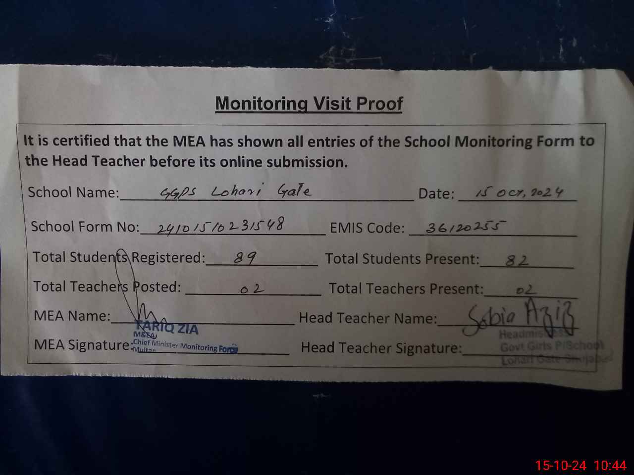 | Monitoring Date: 15-10-2024 | Start Time: 15-10-2024 10:23 AM | End Time: 15-10-2024 10:44 AM | Name of MEA: Mu**** Ta**** Zi**** | |