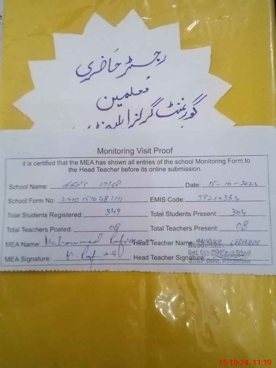 | Attendance Register | Head Teacher | MEA with School | Visit Proof |