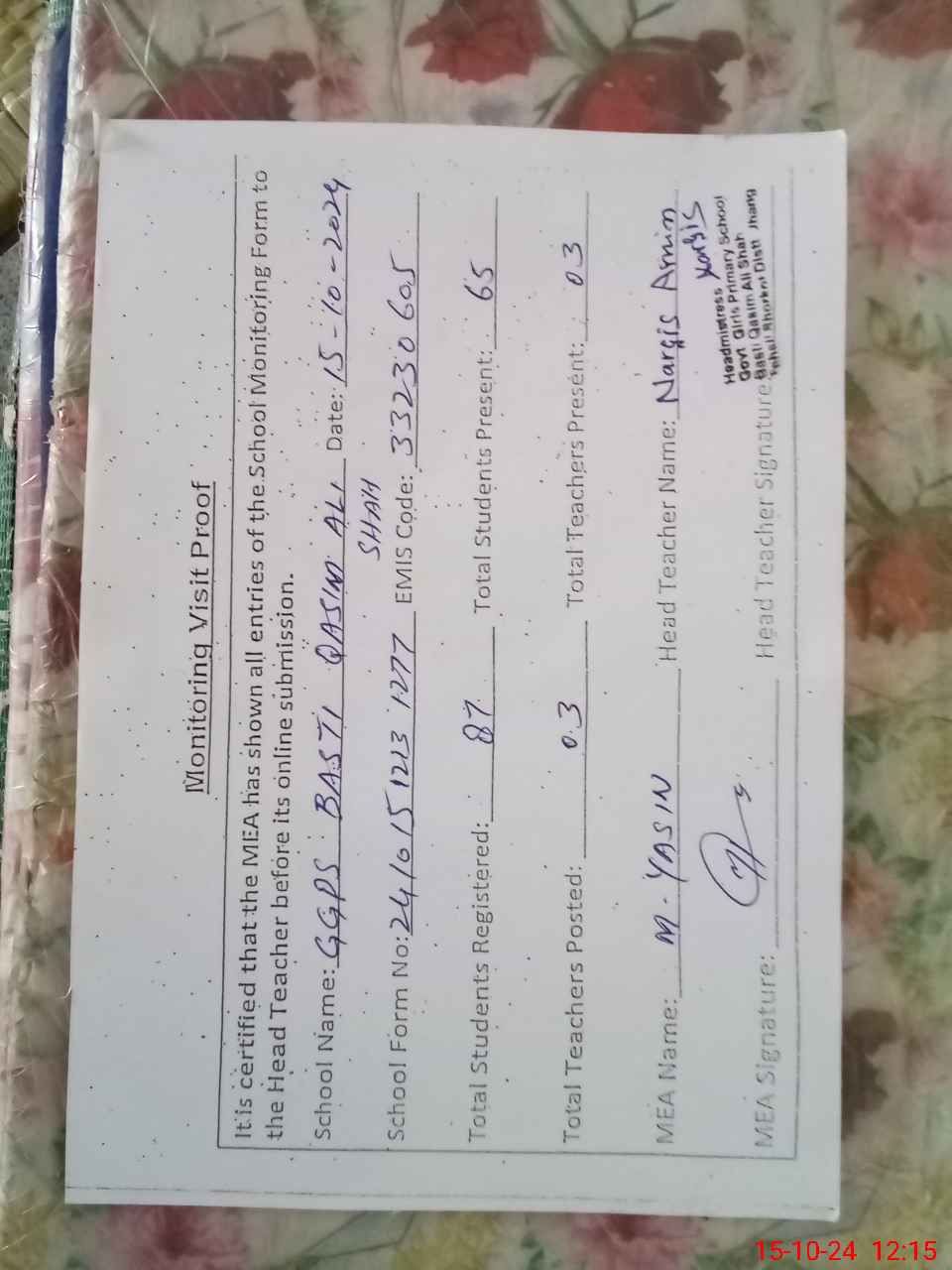 | EMIS Code: 33230605 | Name of School: GGPS BASTI QASIM ALI SHAH | |||