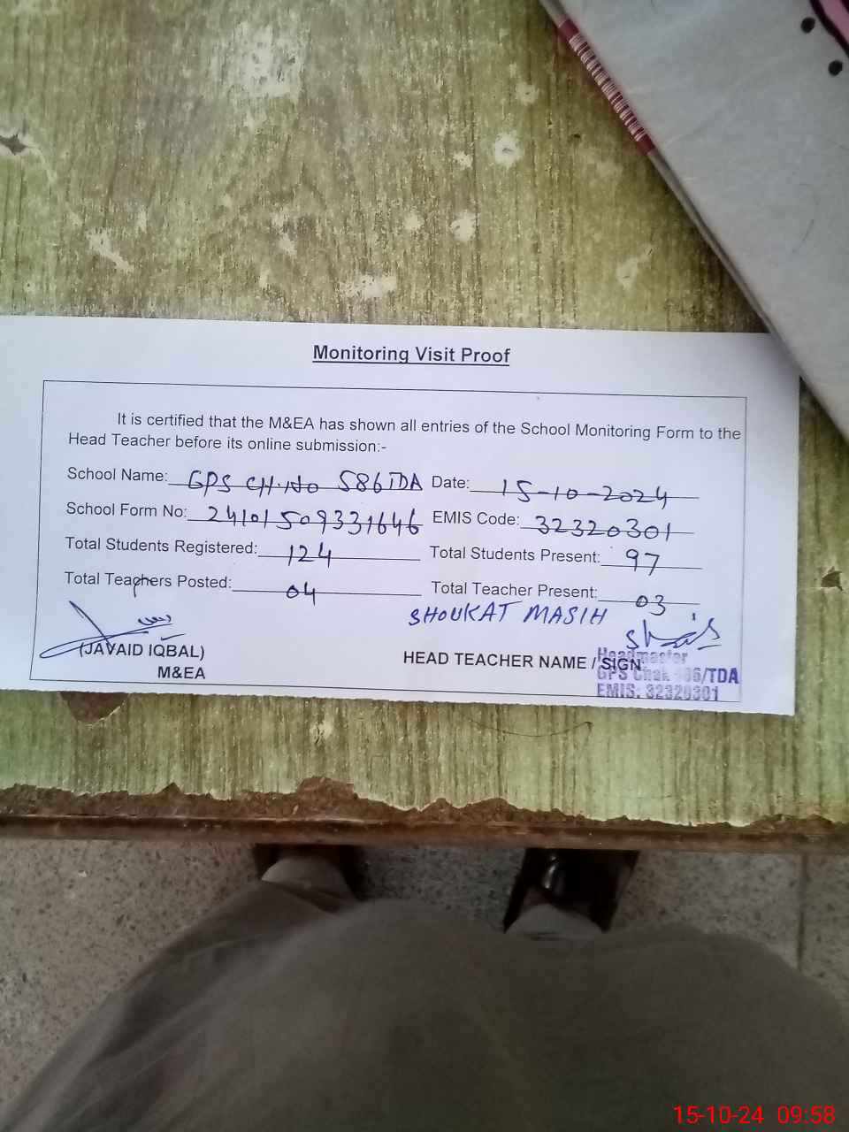 | EMIS Code: 32320301 | Name of School: GPS CHAK NO.586 TDA | |||