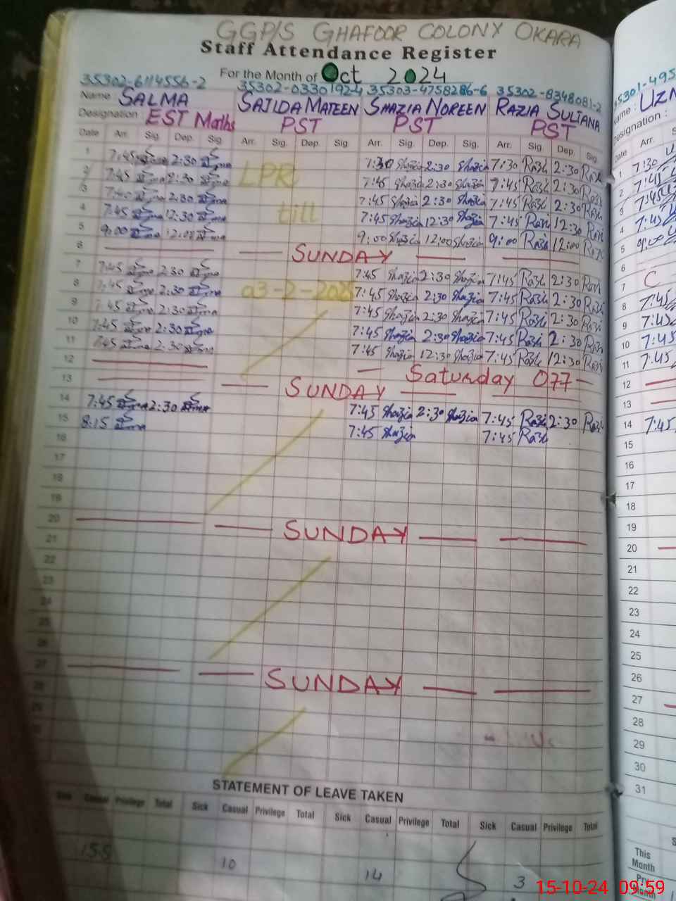| Leave | Duty | Absent | Maternity | Medical | Ex- Pak |