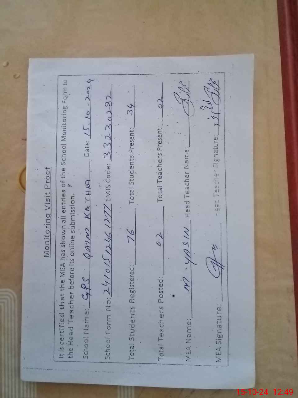 | Attendance Register | Head Teacher | MEA with School | Visit Proof |