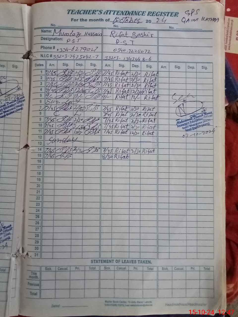 | Name: MU**** HU**** Designation: (School Headmaster's/Headmistress's) PST Phone/Cell Number: 03**** |