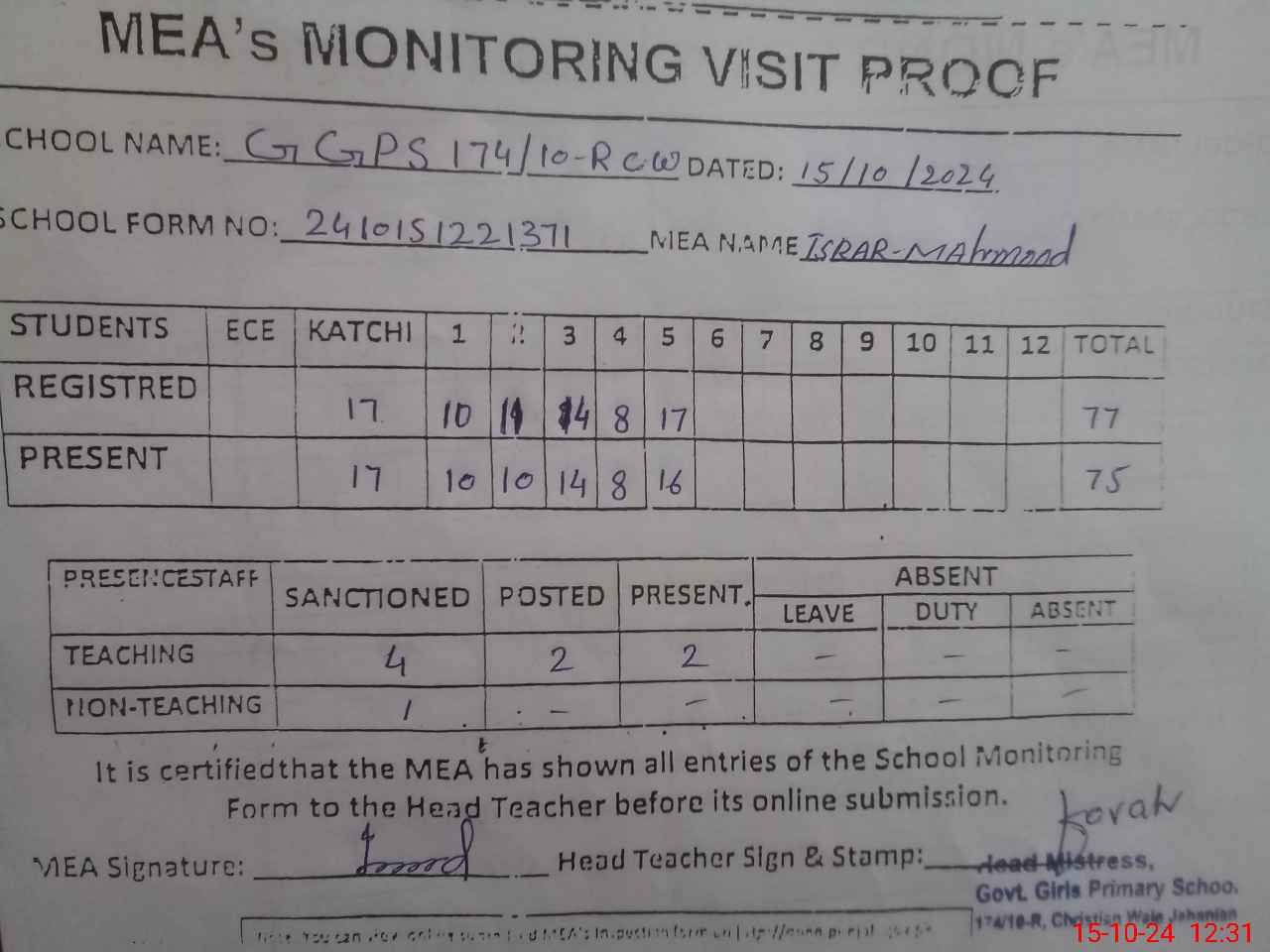 | Attendance Register | Head Teacher | MEA with School | Visit Proof |