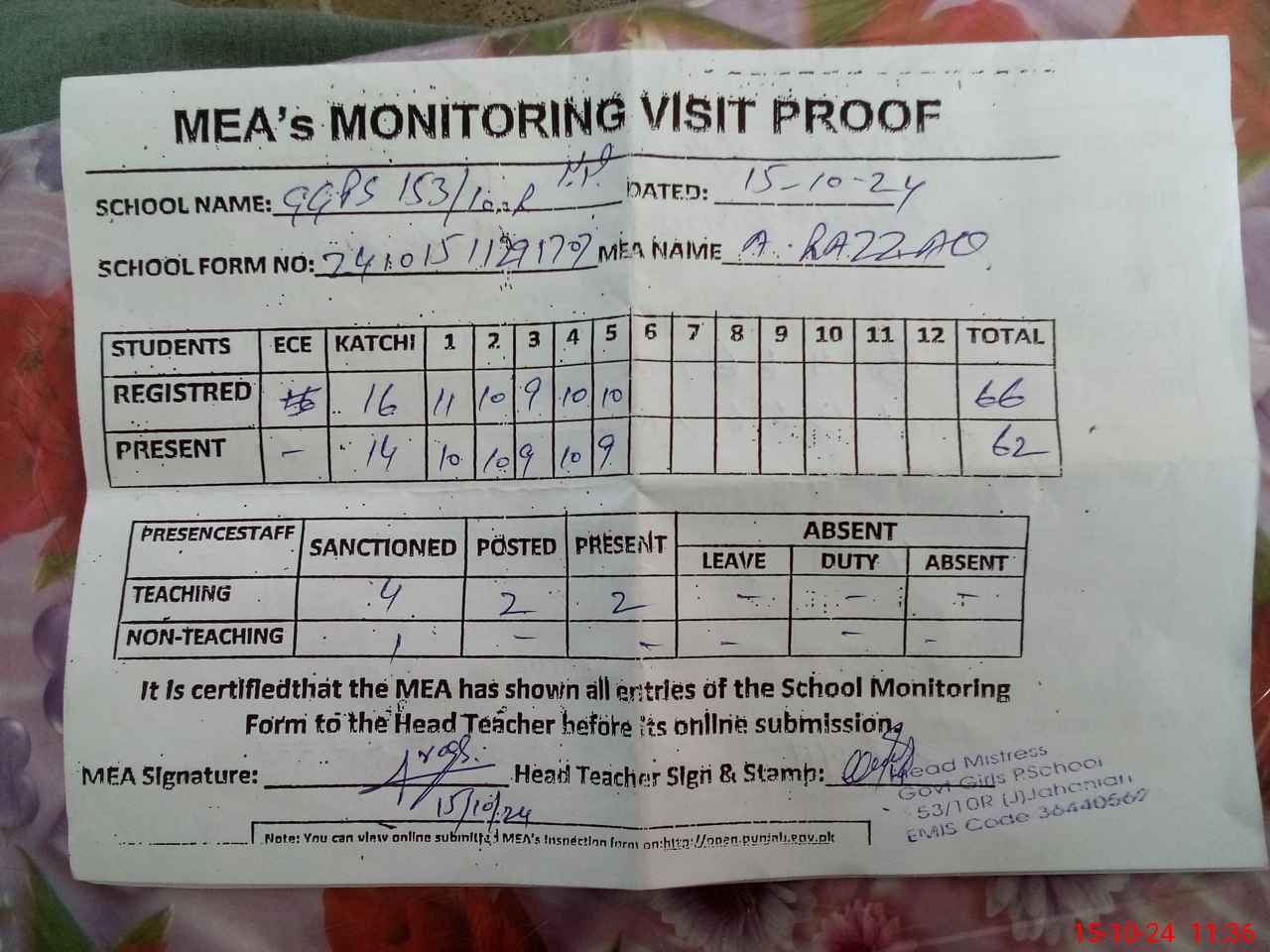 | Attendance Register | Head Teacher | MEA with School | Visit Proof |