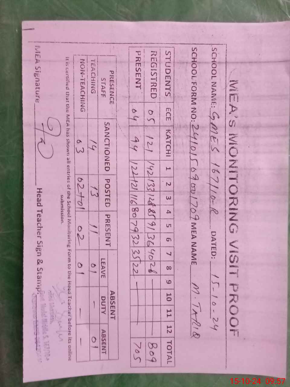 | Attendance Register | Head Teacher | MEA with School | Visit Proof |