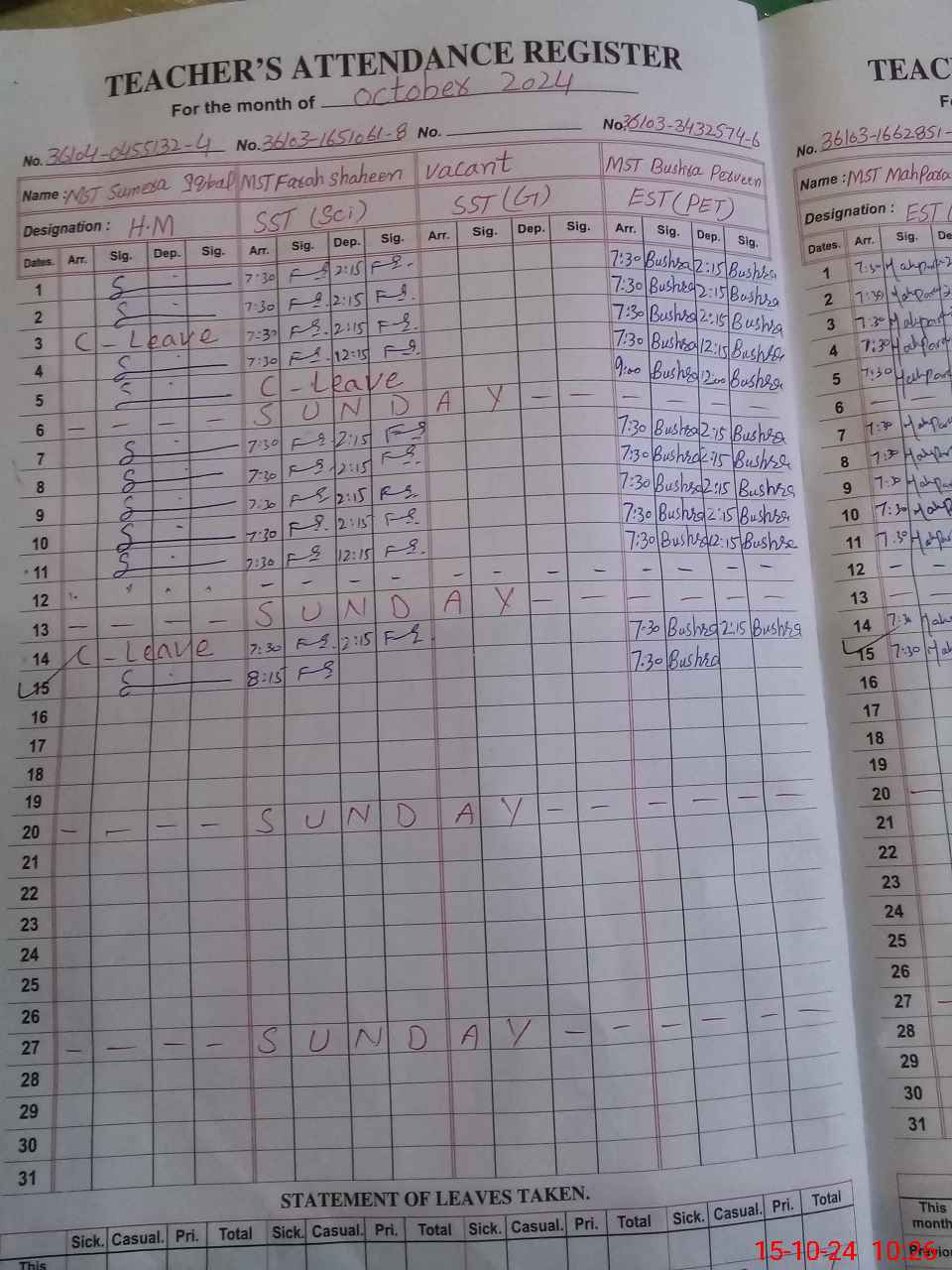 | Leave | Duty | Absent | Maternity | Medical | Ex- Pak |