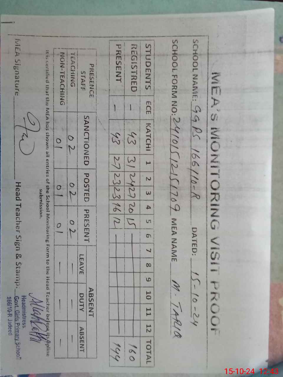 | Attendance Register | Head Teacher | MEA with School | Visit Proof |