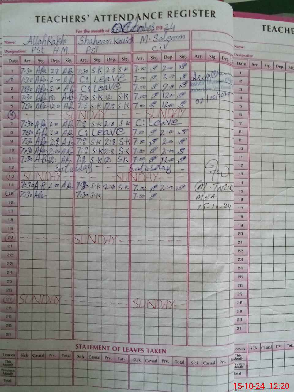 | CNIC | Full Name | Designation | R/C | Absence During Last Calender Month |