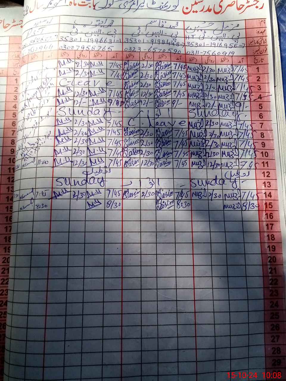 | CNIC | Full Name | Designation | R/C | Absence During Last Calender Month |