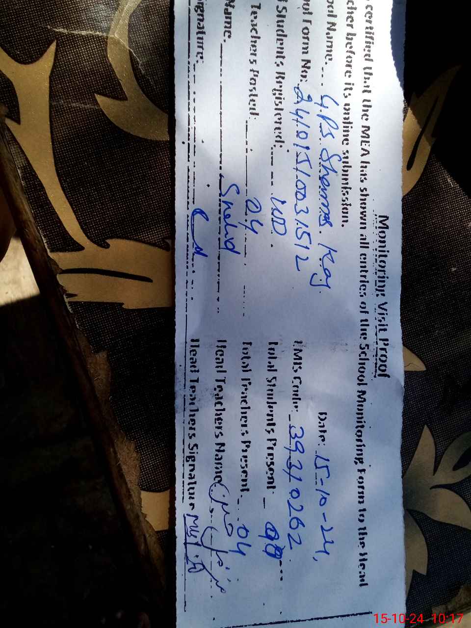 | Monitoring Date: 15-10-2024 | Start Time: 15-10-2024 10:03 AM | End Time: 15-10-2024 10:17 AM | Name of MEA: SH**** YO**** | |