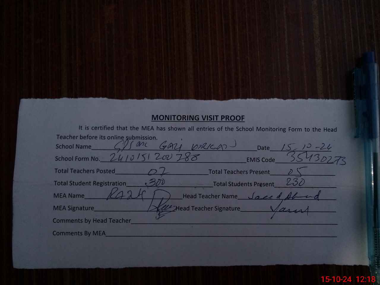 | Attendance Register | Head Teacher | MEA with School | Visit Proof |