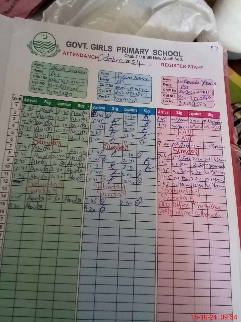 | CNIC | Full Name | Designation | R/C | Absence during last cal. month |