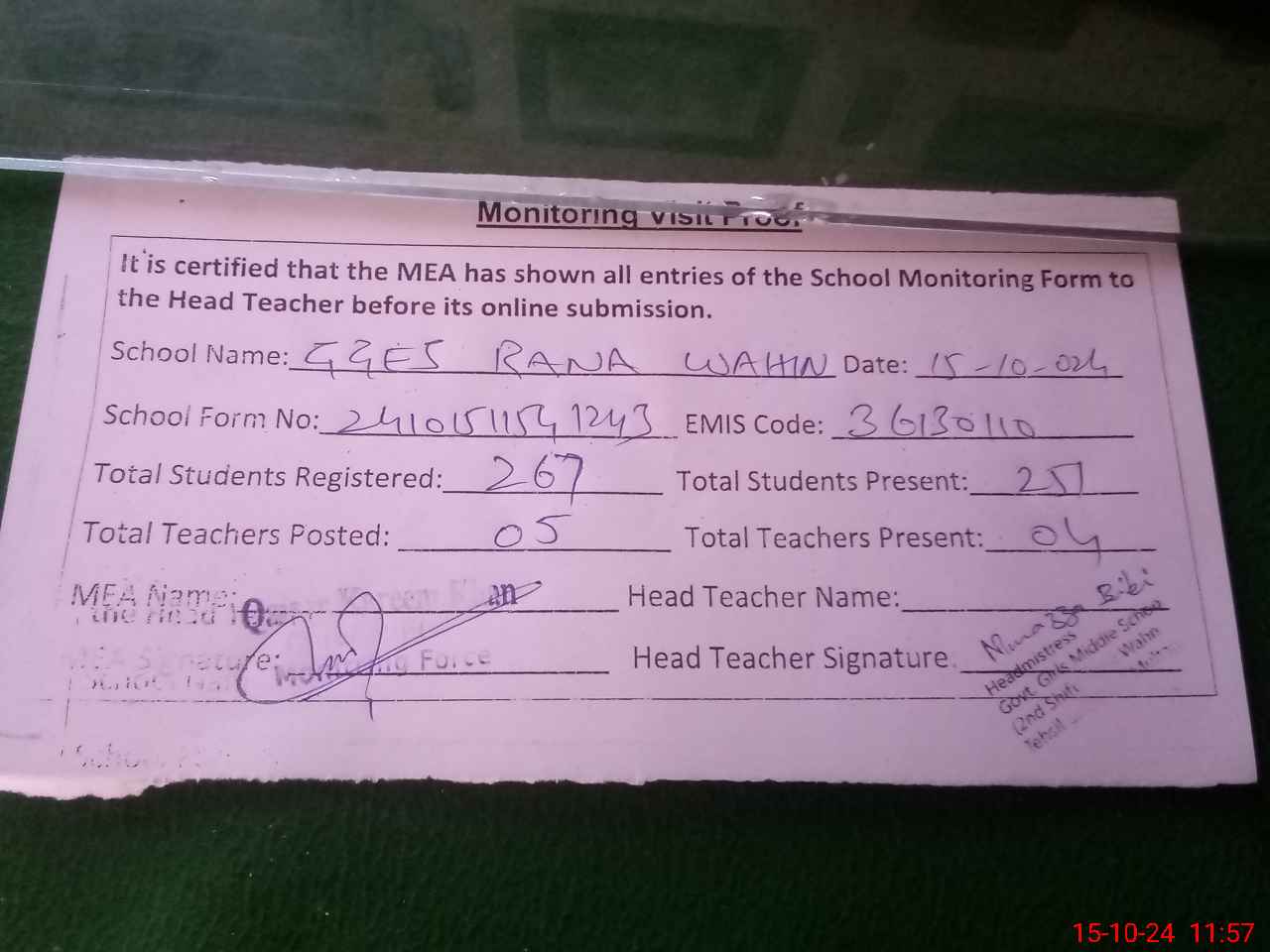 | Attendance Register | Head Teacher | MEA with School | Visit Proof |