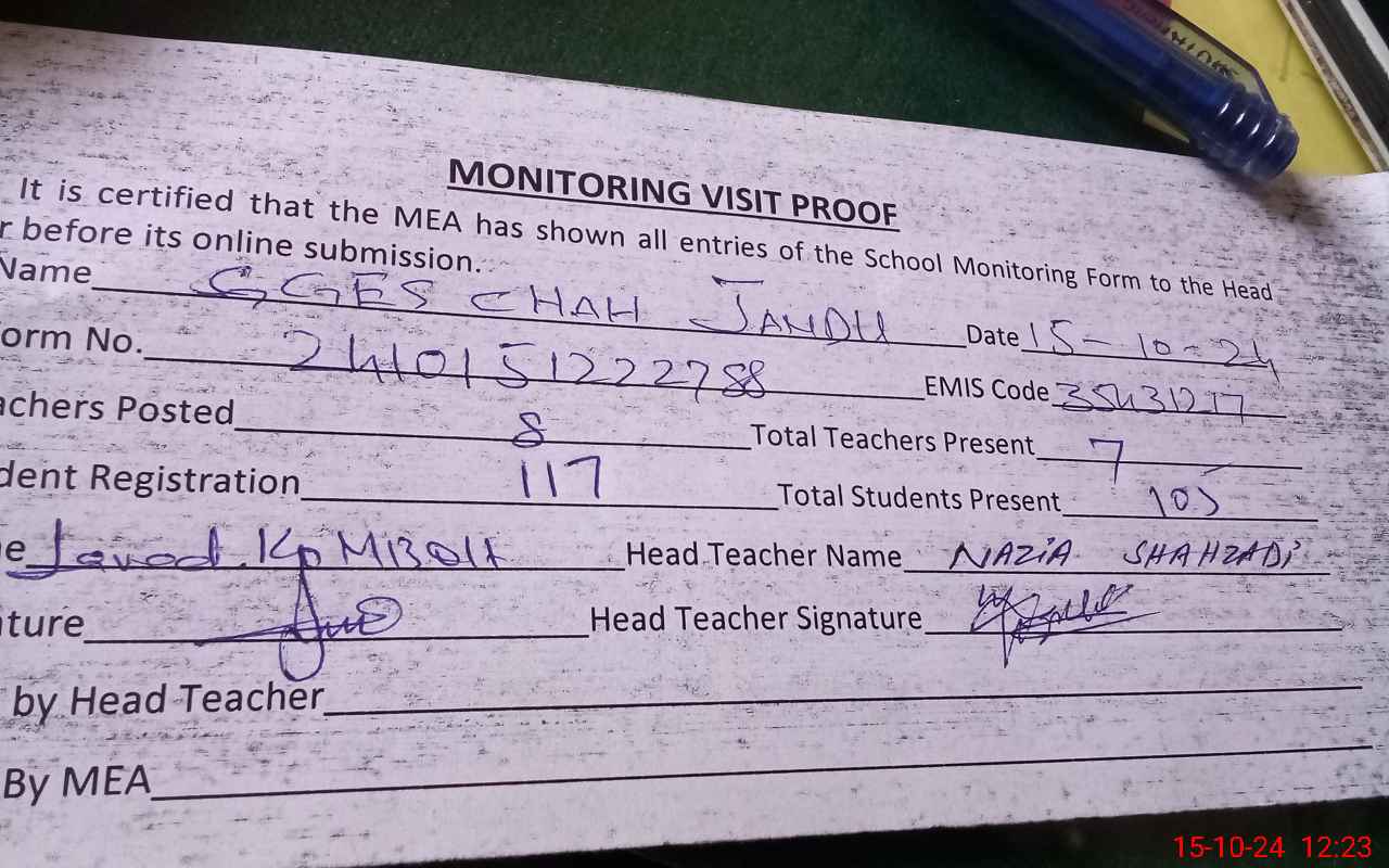 | Attendance Register | Head Teacher | MEA with School | Visit Proof |