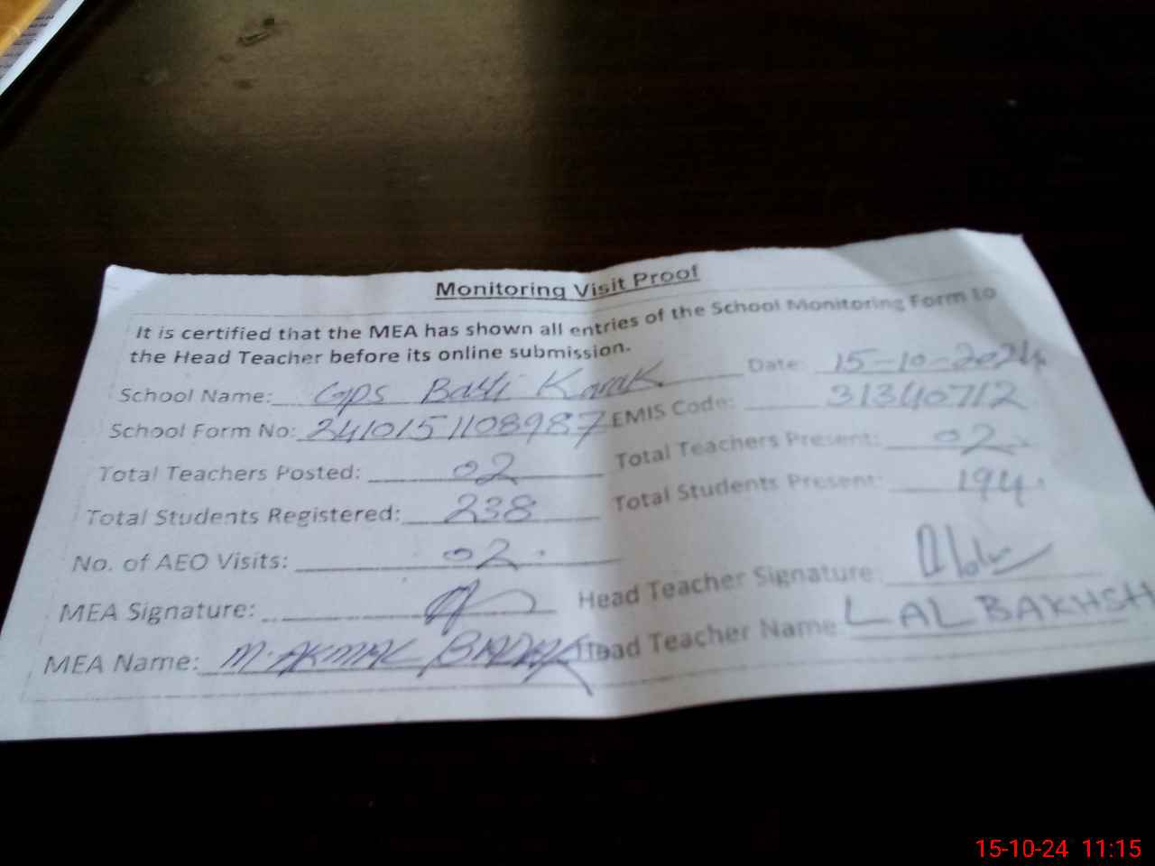 | Monitoring Date: 15-10-2024 | Start Time: 15-10-2024 11:08 AM | End Time: 15-10-2024 11:22 AM | Name of MEA: Mu**** Ak**** Ba**** | |