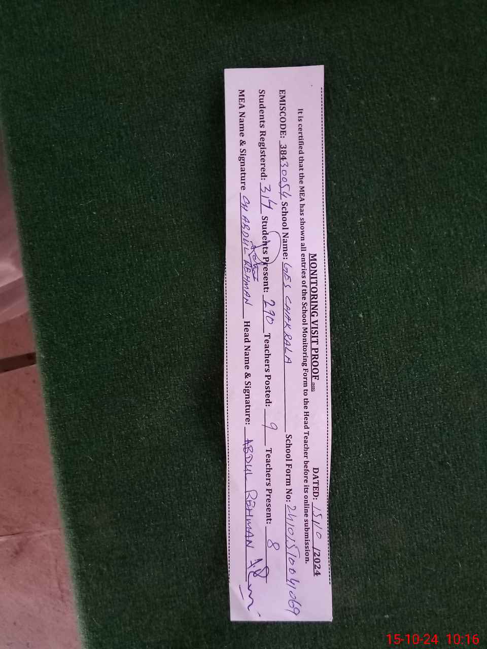| Certified that this School was Inspected by the Undersigned MEA/DMO Today and the Information Stated Above is as Per Record. | |||||