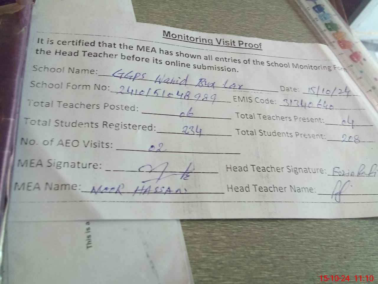| Attendance Register | Head Teacher | MEA with School | Visit Proof |