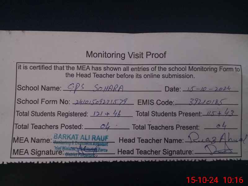 | EMIS Code: 39210185 | Name of School: GPS SOHARA | |||