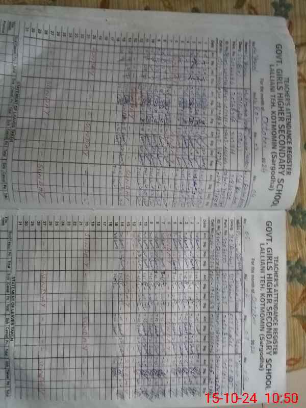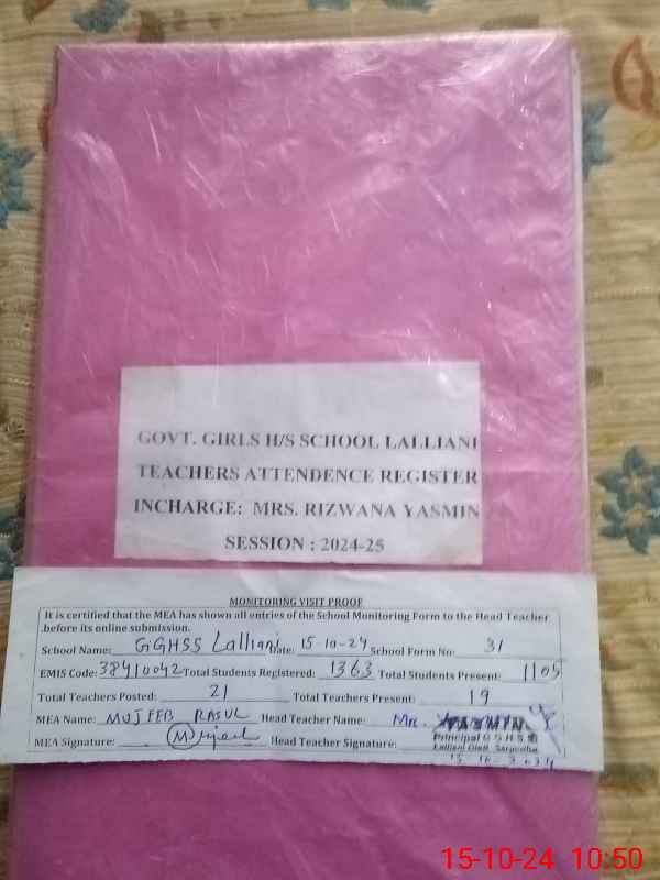 | Remarks (Use Separate Page if Required): During visit found teacher Musrat Shaheen leave was rejected so she marked as unauthorized absent | |||||
