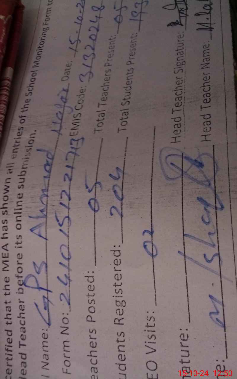 | EMIS Code: 31320248 | Name of School: GPS AHMAD NAGAR | |||