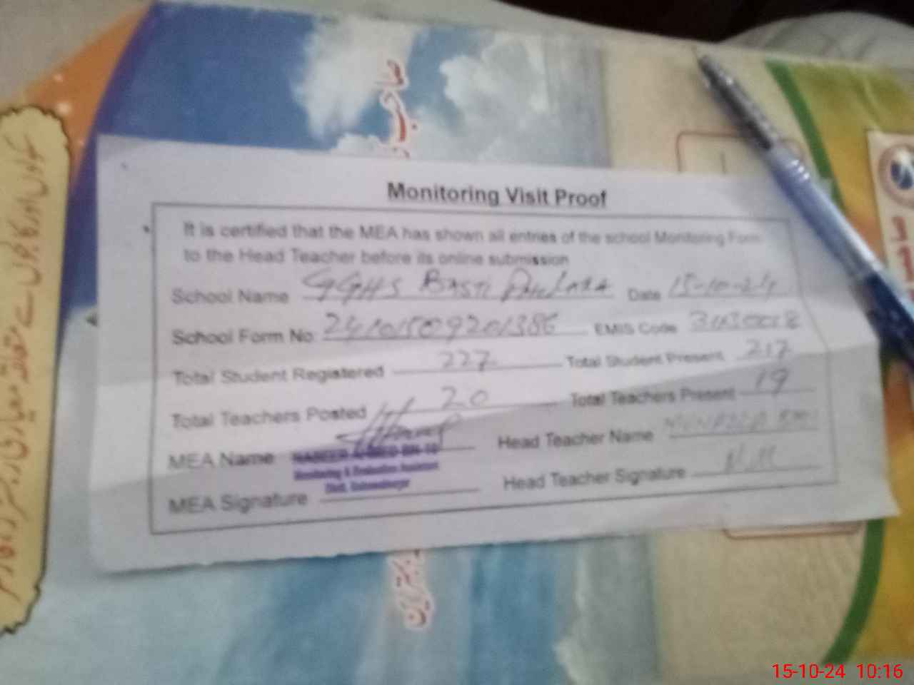 | Certified that this School was Inspected by the Undersigned MEA/DMO Today and the Information Stated Above is as Per Record. | |||||