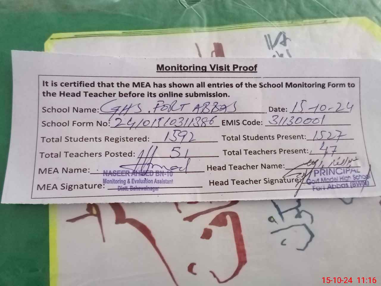 | EMIS Code: 31130001 | Name of School: GHS FORT ABBAS | |||