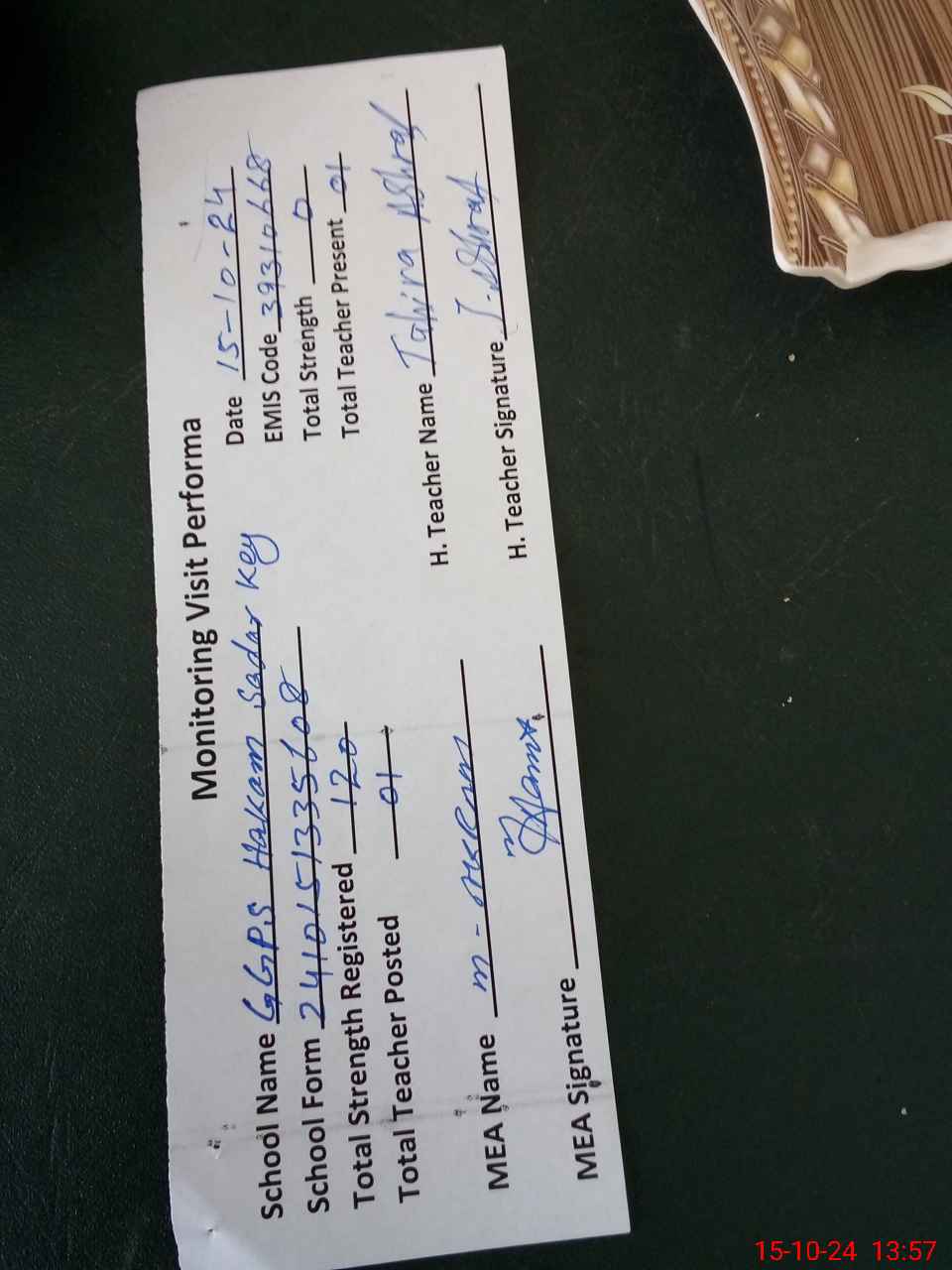 | Attendance Register | Head Teacher | MEA with School | Visit Proof |