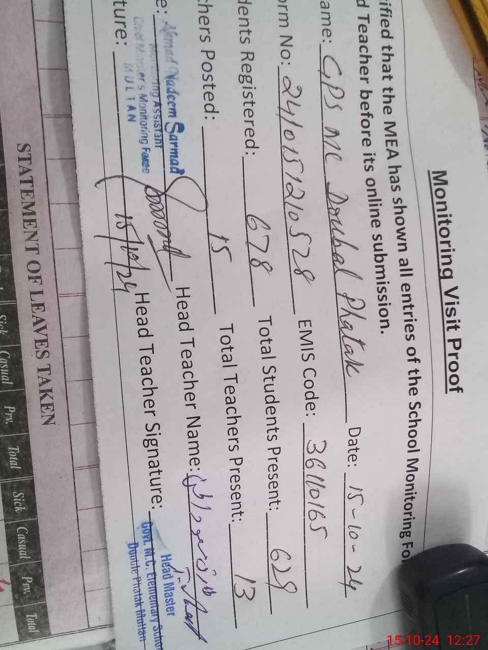 | EMIS Code: 36110165 | Name of School: GPS MC DOUBLE PHATAK VEHARI ROAD MULTAN | |||