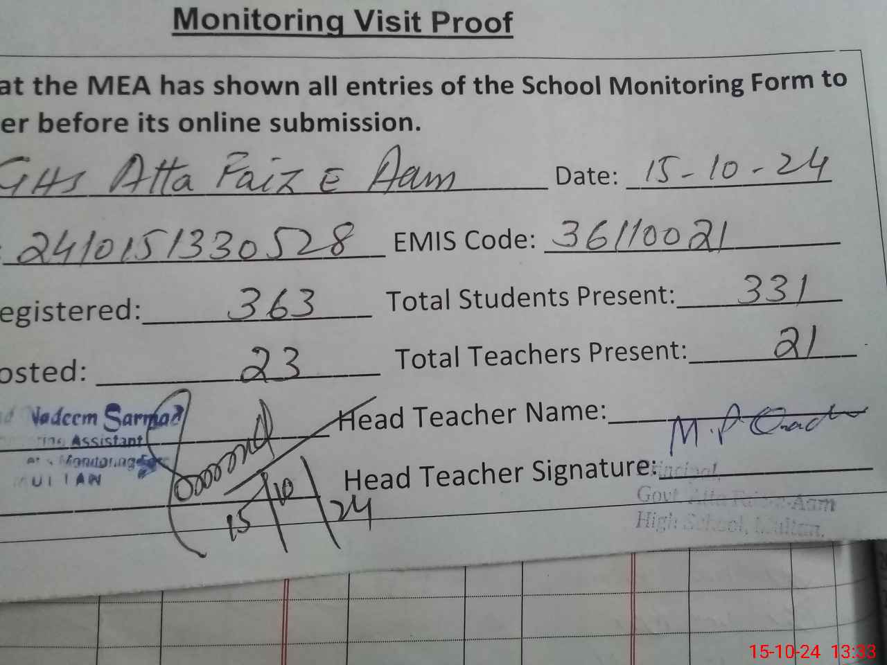 | Attendance Register | Head Teacher | MEA with School | Visit Proof |