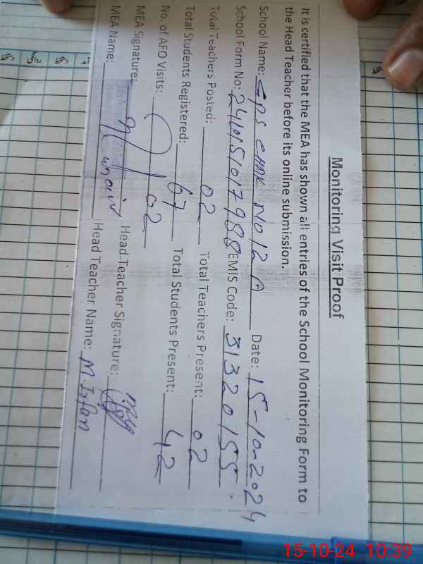 | EMIS Code: 31320155 | Name of School: GPS CHAK 12/A | |||